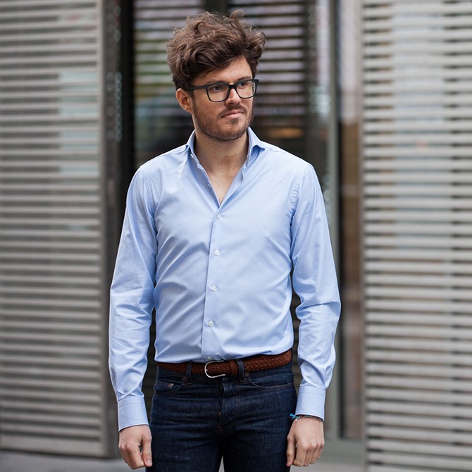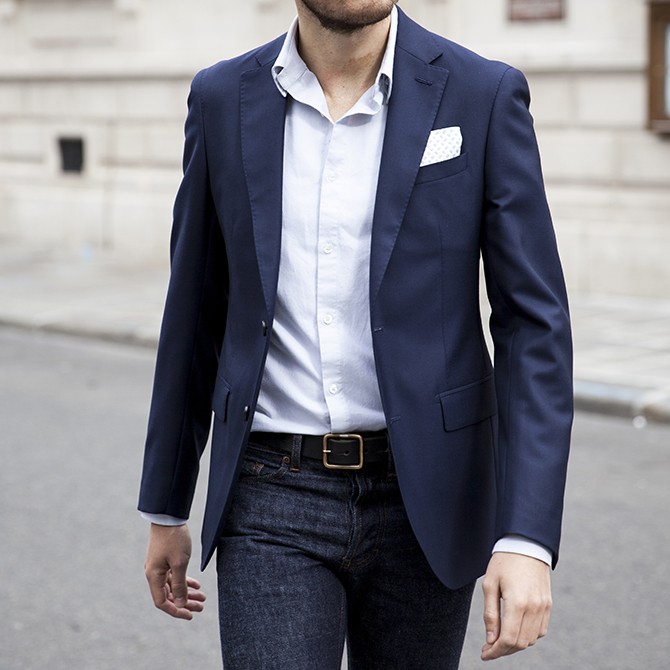 Ce jean est un vrai caméléon, grâce à sa coupe semi-slim et sa couleur brut il peut très bien se porter de manière formelle avec une belle chemise, une paire de bottines et un blazer. C’est le style que l’on retrouve le plus dans les entreprises aujourd’hui pour les trentenaires qui ne sont pas l’obligation du costume-cravate. N’hésitez pas à retrousser le bas de votre pantalon comme sur la photo même avec la paire de bottines pour éviter qu’il s’écrase en forme d’accordéon sur le pied.