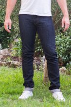 La toile est un modèle de solidité (Selvedge 13 Oz) importée du Japon. Au tout début le jean peut vous sembler un peu rêche mais au fur et à mesure que vous le portez le jean devient de plus en plus agréable et prendra des reflets un peu plus clairs au fur et à mesure du temps. N’hésitez pas à laisser tremper votre jean une bonne nuit à l’eau froide quand vous le recevez car la toile peut un peu déteindre sur vos chaussures ou vos vêtements blancs.
